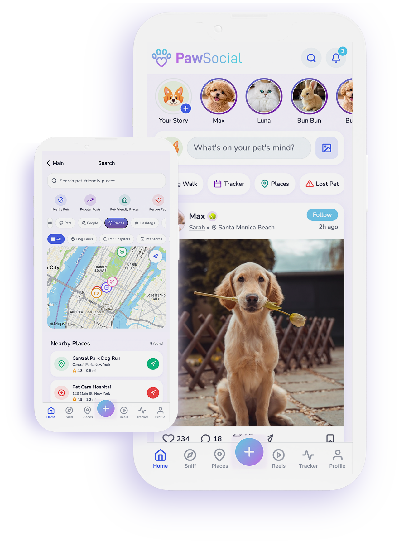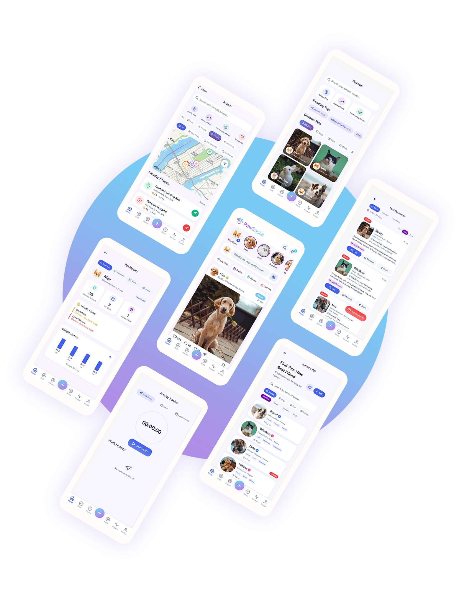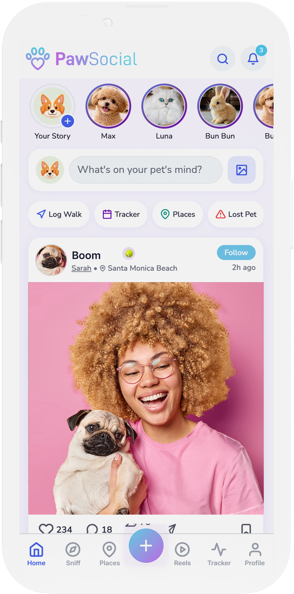 Join the loving community of pet parents — share moments, track health & walks, get smart reminders, discover pet-friendly places, identify breeds with AI, help lost pets, list adoptions, and join weekly contests.